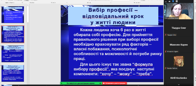 Під час занять учням були надані результати профорієнтаційної діагностики, яка мала на меті визначити типи професійного середовища, які є рекомендованими для подального вибору професії, а також був розглянутий алгоритм успішного вибору майбутньої професії.