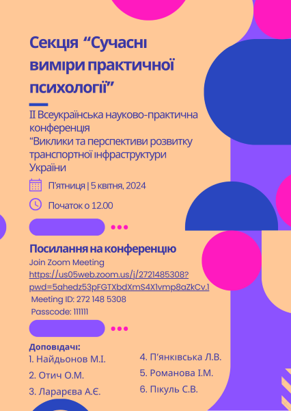 Кафедра психології та соціально-гуманітарних дисциплін, яка є випусковою кафедрою Державного університету інфраструктури та технологій, в межах ІІ Всеукраїнської науково-практичної конференції «Виклики та перспективи розвитку транспортної інфраструктури України» організувала та провела засідання секції «Практичні виміри сучасної психології». Сучасна психологічна проблематика є різноманітною та багатоаспектною, тому науково-педагогічні працівники та здобувачі кафедри підняли у своїх доповідях актуальні практичні питання.
