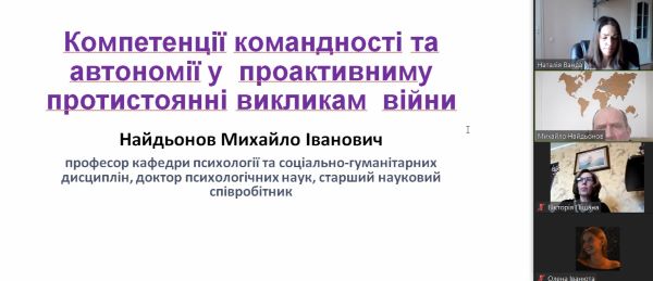 Професором кафедри Михайлом Найдьоновим у своїй доповіді «Компетенції командності та автономії у проактивними протистоянні викликами війни» висвітлено питання співвідношення компетенцій командності та автономії як на рівні особистості, так і на рівні організацій і спільнот. Доповідачем також було висвітлено значення проактивності для розвитку конкурентоспроможності.