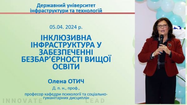 Актуальну проблему інклюзивної інфраструктури та її роль у забезпеченні безбар’єрності вищої освіти висвітлила професор Олена Отич.