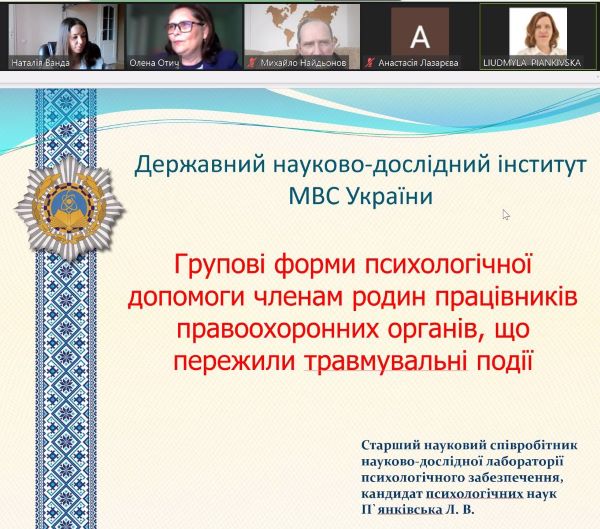 Проблематику психологічної допомоги при ПТСР окреслила у своєму виступі почесна гостя секції старший науковий співробітник лабораторії психологічного забезпечення Державного науково-дослідного інституту МВС України Людмила П’янківська. Під час доповіді на тему «Групові форми психологічної допомоги членам родин працівників правоохоронних органів, що пережили травмувальні події» науковиця висвітлила проблеми, що впливають на психічне здоров’я зазначеної категорії населення та визначила основні шляхи та принципи надання їм психологічної допомоги.