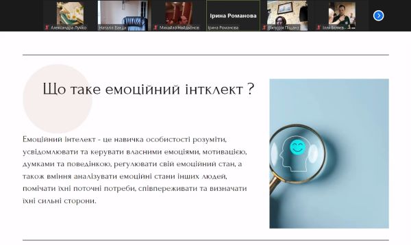 Дебютне наукове дослідження першокурсниці Ірини Романової було присвячено емоційному інтелекту та конкретизовано в межах теми «Особливості розвитку емоційного інтелекту особистості юнацького віку під час воєнних дій в Україні». Ірина зазначила, що в умовах сьогодення кожній особистості необхідно навчитись розпізнавати свої почуття та розвивати навички самоконтролю. Доповідачкою надані поради для розвитку емоційного інтелекту.