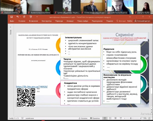 Здобувачка ОПП «Практична психологія» Кикла Дарина 23 травня 2024 року взяла участь у Науково-практичному онлайн-семінарі «Обдарованість: методи діагностики та шляхи розвитку», яка була організована Інститутом Обдарованої дитини НАПН України. Другокурсниця поділилася своїм баченням проблеми обдарованості