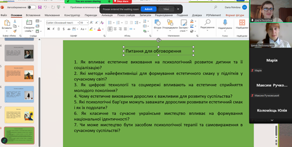 Другий тематичний блок дискусії був відкритий презентацією здобувачки 1 курсу ОПП «Практична психологія» Анастасії Шевченко, яке було присвячене естетичному вихованню в сучасному українському суспільстві.