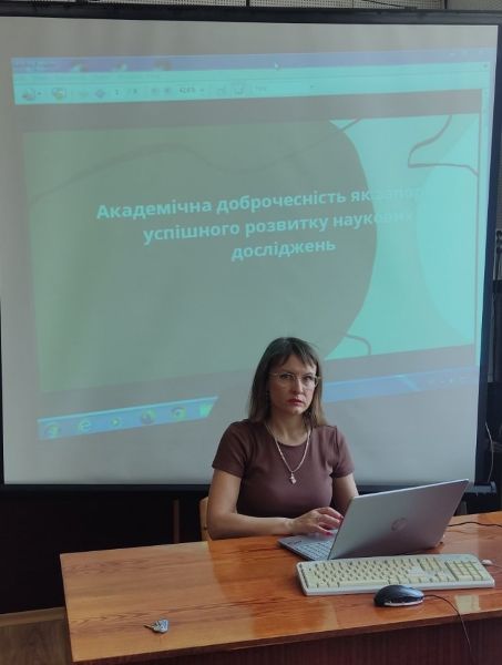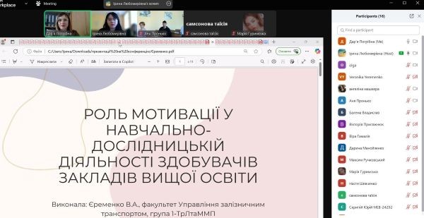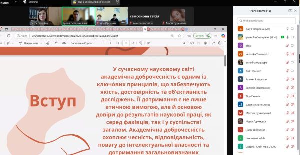 Першокурсниця Єременко Вероніка («Транспортна логістика») продовжила проблему академічної доброчесності та академічної культури, проаналізувавши дані проблеми в контексті мотивації навчально-дослідницького процесу.