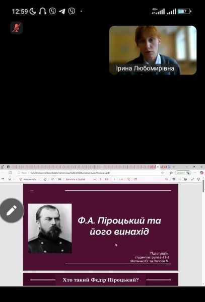 Юлія Мельник (2 курс «Транспортні технології») познайомила аудиторію з історією винаходу першого трамваю на електричній тязі, акцентувавши увагу аудиторії на особистості вченого Ф.Пероцького