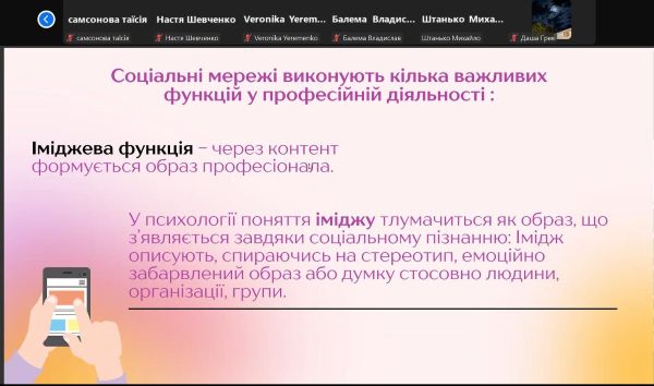 Доповідачка наголосила, що соцмережі давно вже перестали сприйматися виключно як місце для розваг і інформування, а стали інструментом професійної реалізації та підвищення кваліфікації фахівців.