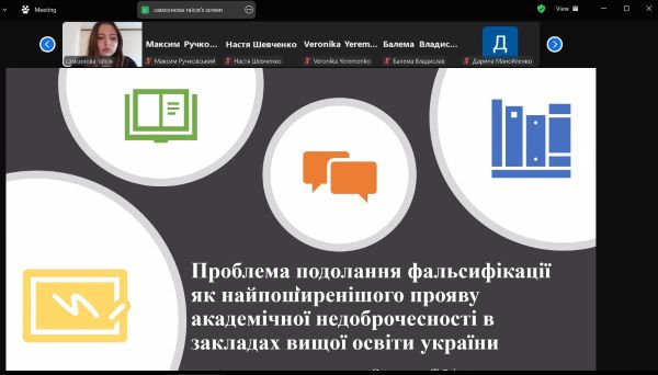 Проблема академічної недоброчесності, яка є однією з причин непрофесіоналізму випускників ЗВО, була піднята  двома учасниками конференції. Здобувачка першого курсу («Практична психологія») Таїсія Самсонова визначила фальсифікацію основним проявом академічної недоброчесності, адже саме спотворення наукових даних може призвести до фатальних наслідків на практиці