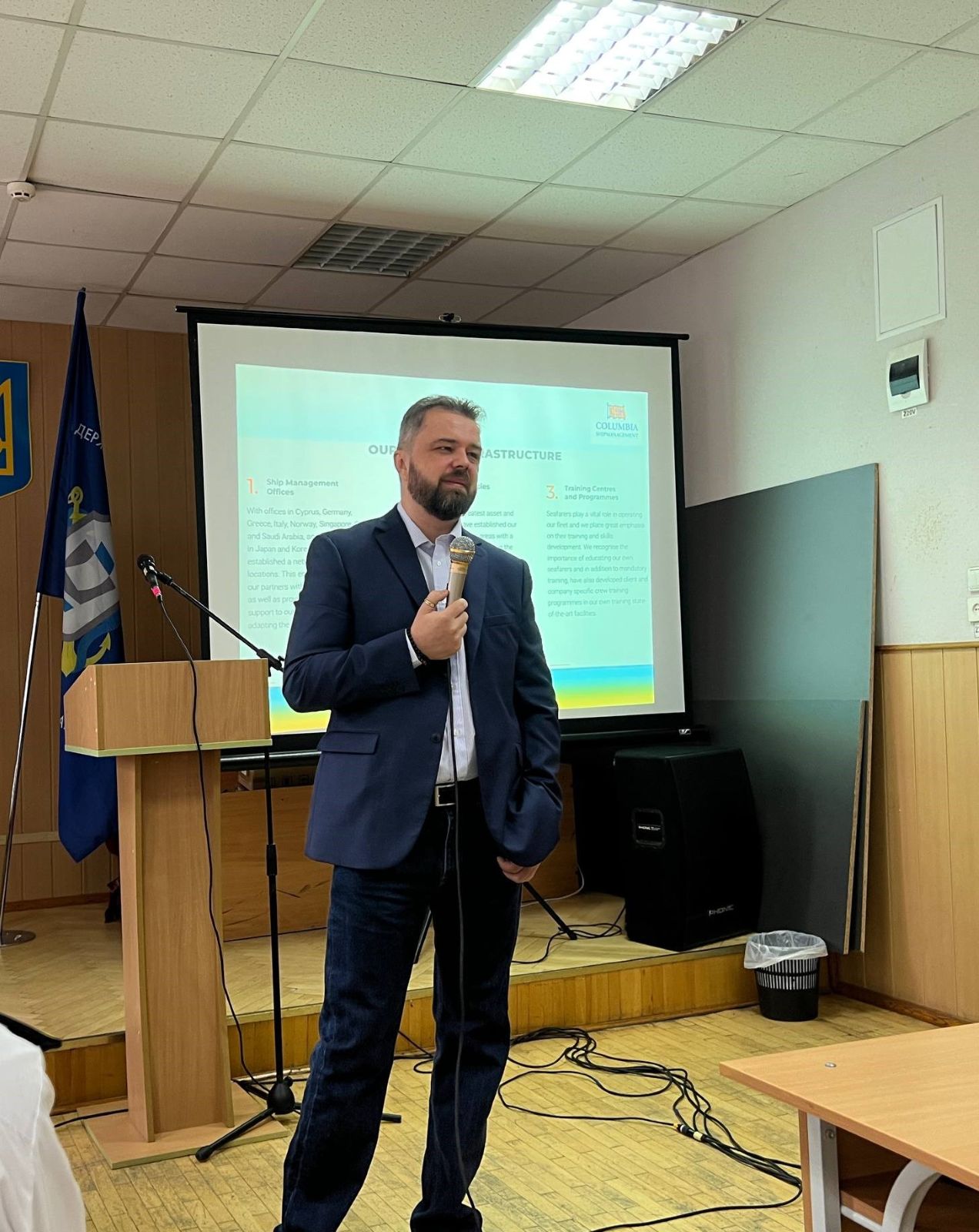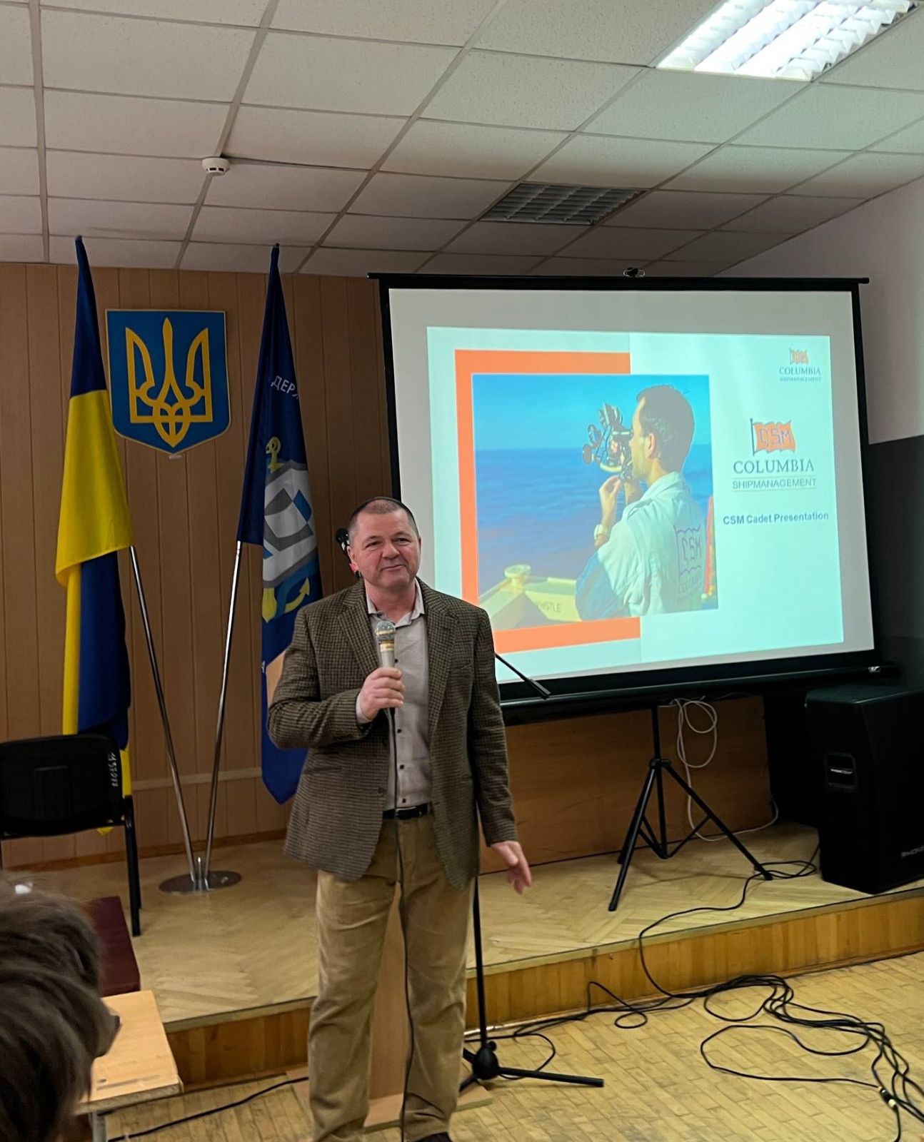 Гості прочитали тематичну лекцію-презентацію для студентів. Майбутні моряки дізналися про переваги та умови вступу до кадетської програми, зрозуміли важливість не лише професійних знань, а й англійської мови та soft skills, а також усвідомили необхідність бути конкурентоздатними та впевненими у своїх силах. Для успішного заміщення вакантної посади кадета на суднах компанії Columbia Shipmanagement потрібно пройти велику кількість тестів та співбесід.