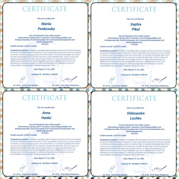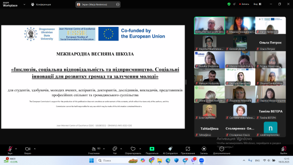 З 17 по 21 березня 2025 року здобувачі освіти ОПП «Практична психологія» Лучко Олександра, Пікуль Софія, Гайдай Анна, Пеньковська Марія та викладачі кафедри доцент Соляник Марина і доцент Неїжпапа Людмила взяли участь в онлайн-сесії Міжнародної весняної школи «Інклюзія, соціальна відповідальність та підприємництво. Соціальні інновації для розвитку громад та залучення молоді», яка проводилась в рамках імплементації проєкту Центр досконалості Жана Монне «Європейські Студії соціальних інновацій в освіті».