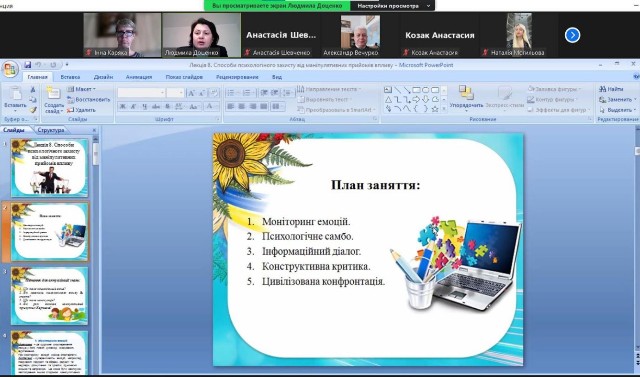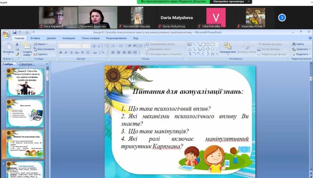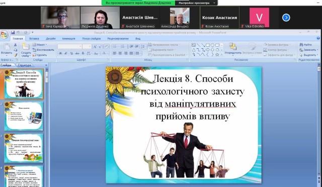 24 квітня 2024 року в.о. завідувача кафедри, кандидат психологіяних наук, доцент Доценко Л.В. провела відкрите лекційне заняття на тему «Способи психологічного захисту від маніпулятивних прийомів впливу» в рамках навчальної дисципліни «Психологія самопрезентації особистості» для здобувачів освітнього рівня «Магістр» денної форми навчання першого року навчання, спеціальності 053 «Психологія.