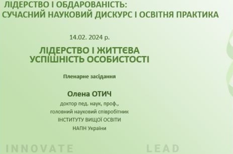 Професор кафедри психології та соціально-гуманітарних дисциплін Олена Отич виступила із доповіддю на пленарному засіданні Всеукраїнської науково-практичної конференції «Лідерство і обдарованість: сучасний науковий дискурс і освітня практика», яка відбулася 14–16 лютого 2024 р.