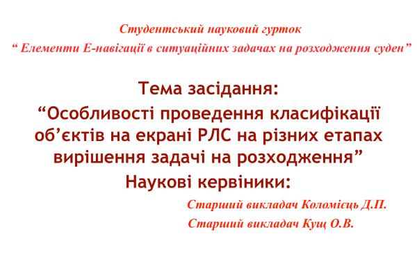 – формування певних навичок майбутніх судноводіїв у питаннях класифікації суден, положення яких виявлено за допомогою РЛС за ступенем небезпеки;