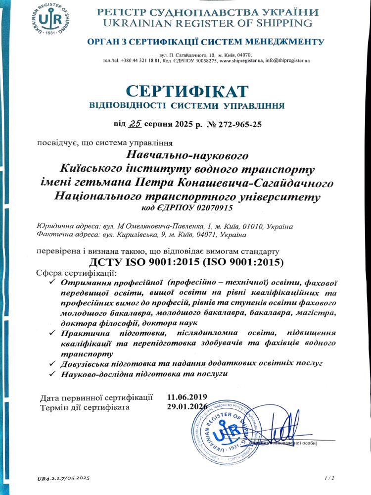 Навчально-науковий Київський інститут водного транспорту імені гетьмана Петра Конашевича-Сагайдачного НТУ продовжує розвивати стратегічні партнерства та підтверджувати високі стандарти освітньої діяльності.